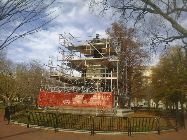 I was meeting a tour at the Jackson statue in Lafayette Park when passing the man himself. I wish I could say what’s going on, but turned up nothing so far. But, my 33 years experience as a journalist tells me, uh, that they’re working on him. Hopefully, I’ll have something to report soon.