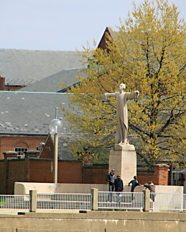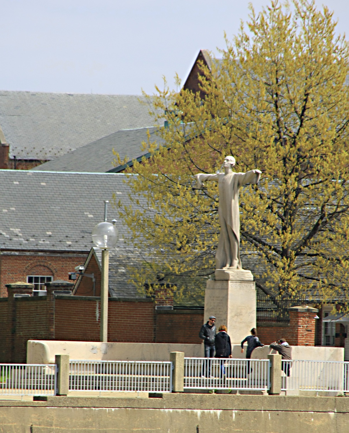 The memorial next to Fort McNair overlooking the Washington Channel near 4th and P Sts. SW is granite and sculpted by Gertrude Vanderbilt Whitney. The architect was Henry Bacon, who you might know from building the Lincoln Memorial. The 18-foot male is shown with outstretched arms to symbolize selflessness of the men who gave up their spots in the lifeboats to women and children. The 20-ton base is granite from Massachusetts.