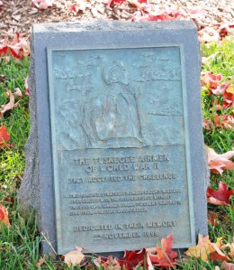 The Tuskegee Airmen tree was dedicated in November 1995. The plaque says, “Two hundred strategic bomber escort missions over Europe with the 15th Air Force without the loss of a single bomber to enemy aircraft, 1944-1945, a record unsurpassed.”