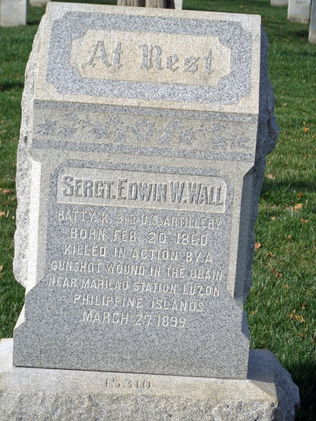 Sergt. Edwin W. Wall, says the granite marker near the mast of the Maine behind the Tomb of the Unknowns, was “killed in action by a gunshot wound in the brain near Mailao Station Luzon Philippine Islands March 27, 1899.”