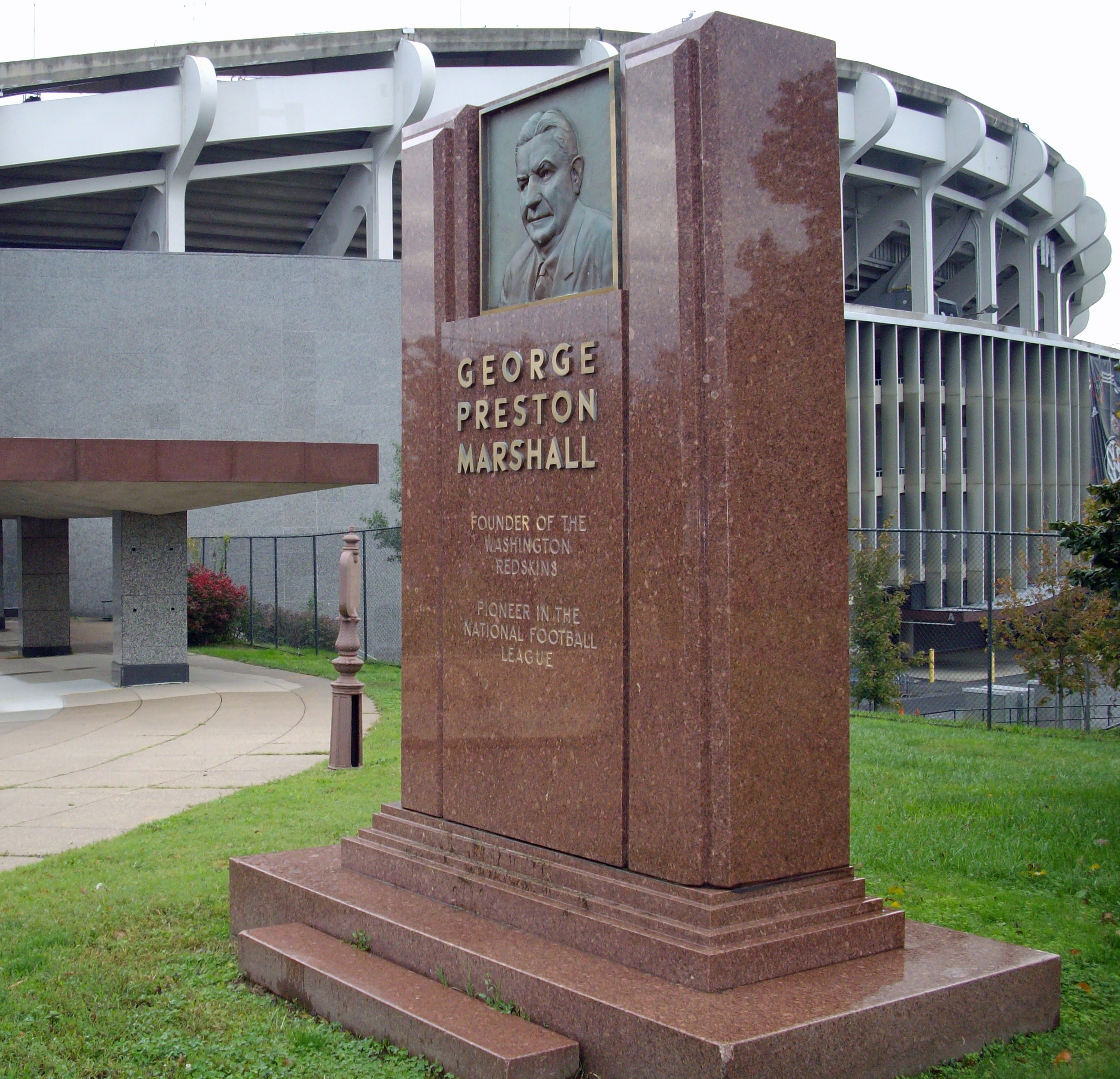 The first game was a Redskins loss (what else?) and the owner was George Preston Marshall, who brought the team from Boston in 1937. There’s a large red granite marker on the right side of the entrance by the street with Marshall’s image.