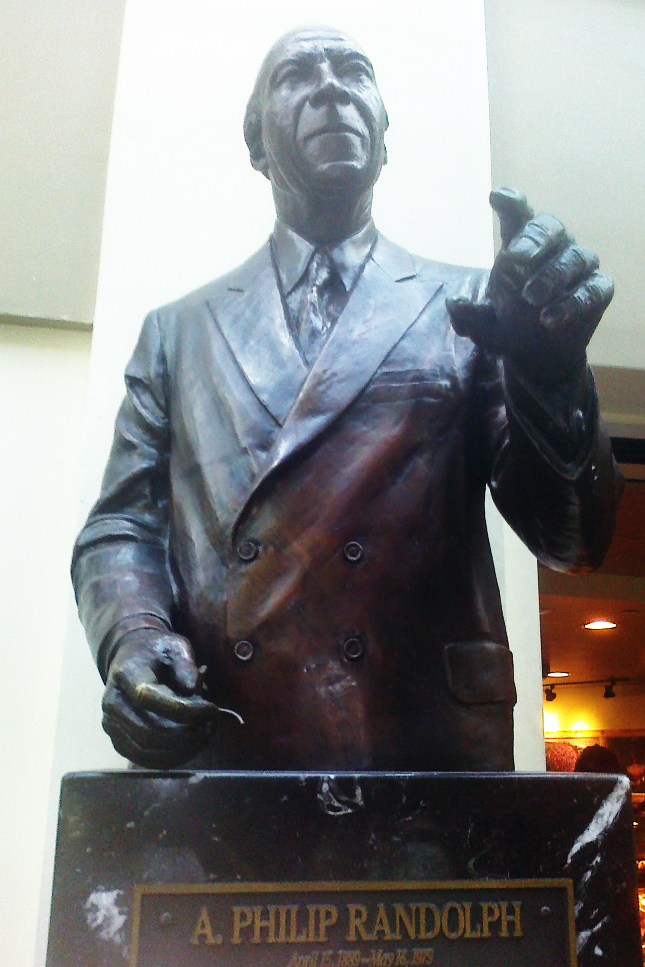 A. Philip Randolph was among America’s leading black labor and civil rights leaders. The plaque beneath the bust says Randolph founded the brotherhood of sleeping car porters (hence the railroad station connection) and “conceived and initiated the 1963 march on Washington.”