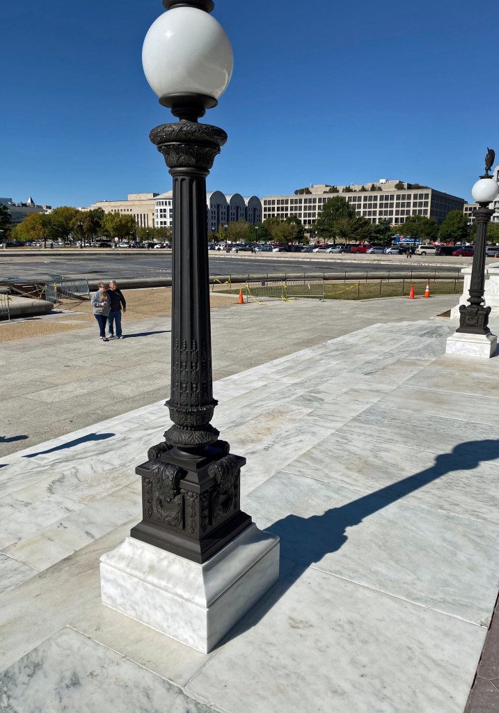 Eight bronze lamp posts were erected as replicas of the original design of Edward Pearce Casey dedicated in 1921. The posts have 16 separate castings plus the eagle.