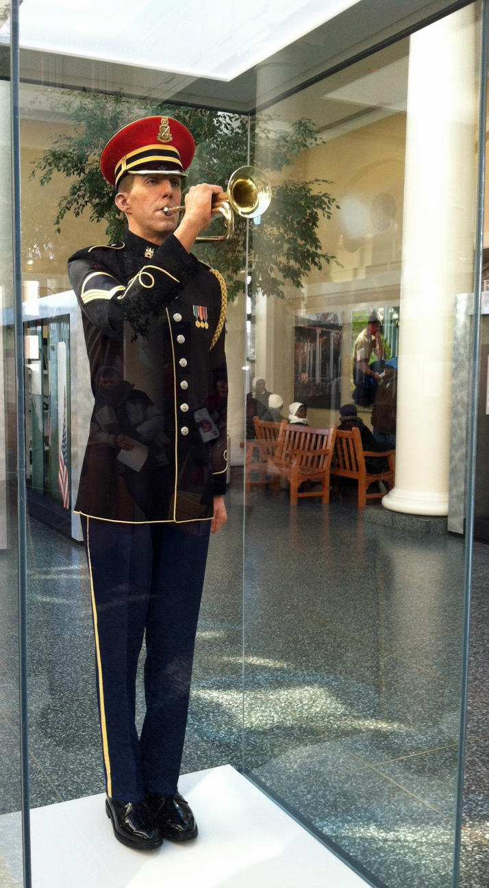 The first makeover of the Arlington National Cemetery welcome center in 20 years included six large murals of scenes around the cemetery. However, the centerpiece of the room is a Taps bugler patterned after Staff Sgt. Jesse Tubb of South Lake Tahoe, Calif. who’s part of the U.S. Army Band. The lifesized model shows Tubbs playing the song performed throughout Arlington during funerals.