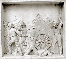 This monument gets some notoriety for its depiction of Greenup’s death. In a three-foot relief panel, Greenup is shown being crushed under the horse-drawn fire engine of Columbia Engine Co. No. 1. Seems Greenup fell under the engine while rushing to the fire and was killed instantly. Amazingly, this very pumper is still in storage for future display.