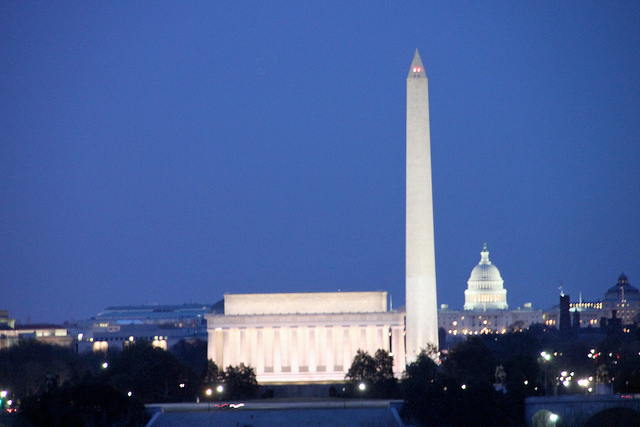 The best nighttime view is from the nearby Netherlands Carillion between Arlington National Cemetery and the Iwo Jima memorial. You can line up the Lincoln Memorial, Washington Monument and U.S. Capitol. The cemetery is closed at night so this is your best stop, though the Air Force Memorial on the other side of ANC is pretty good, too.