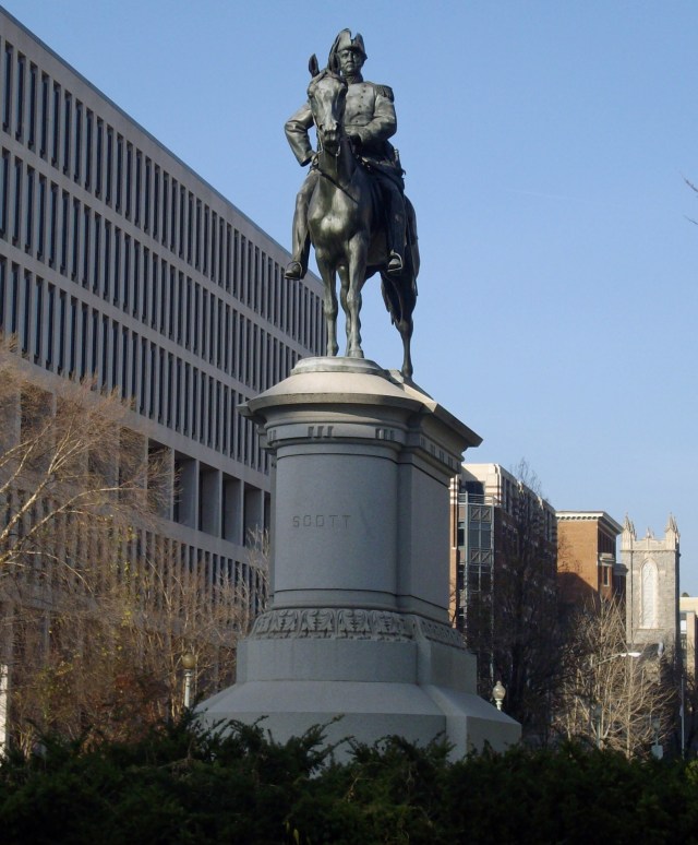 Gen. Winfield Scott’s statue lies in the three-sided circle of Massachusetts and Rhode Island Aves. and 16th St. N.W. just blocks from the White House that he failed to win in 1852. Indeed, Scott nearly ran in 1860 but decided he was getting too old. Instead, Scott lived until 1866, one year after Abraham Lincoln’s assassination.