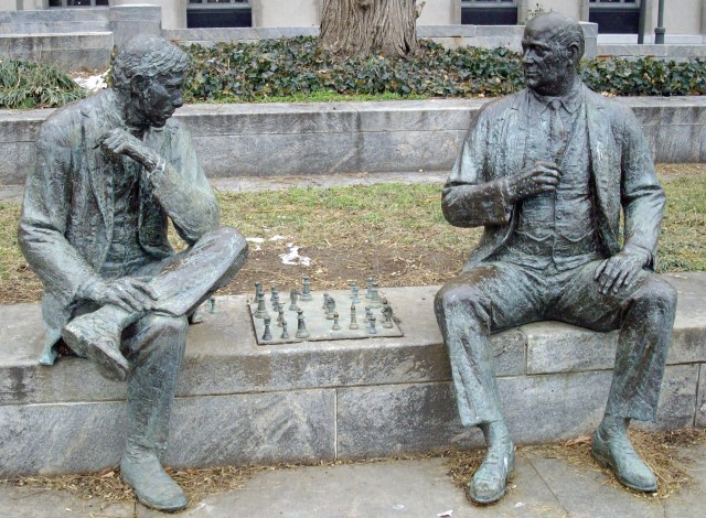 The bronze artwork lies in John Marshall Park on 4th and C Sts. N.W. aside the Canadian embassy and just a short stroll from the court houses. Supposedly, the park is the perfect place for lawyers to play chess on their lunch hour, though I’ve never stumbled upon a live version.