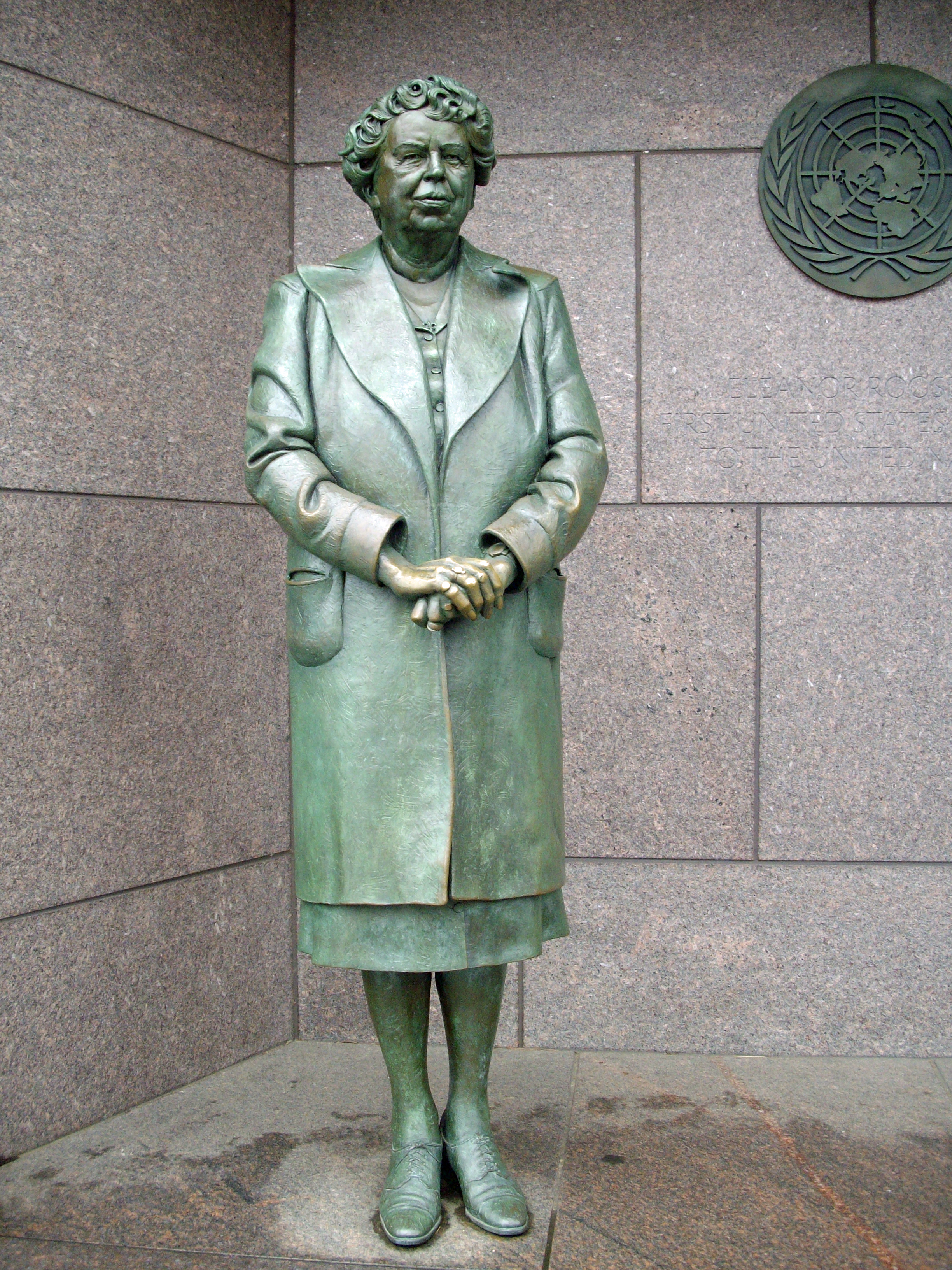 Eleanor is standing next to the United Nations symbol given her staunch support for it. She’s the only First Lady honored with a statue at a presidential memorial. Given Eleanor served the longest of any First Lady and often spoke for her husband at events, she certainly deserves it.