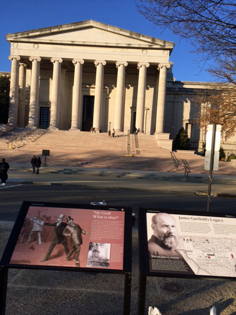 But, it’s not the only presidential assassination spot in town. James Garfield (my 10th cousin) was shot at what’s now the National Gallery of Art’s West Building. It was the Baltimore & Potomac Railway Station and the new president was walking through it on July 2, 1881 when shot by a madman named Charles Guiteau. It seems Guiteau was told by God to become the U.S. ambassador to France despite no qualifications. When Guiteau was rebuffed, God said to kill Garfield so Guiteau shot him twice. “My God, what is this?” Garfield exclaimed.