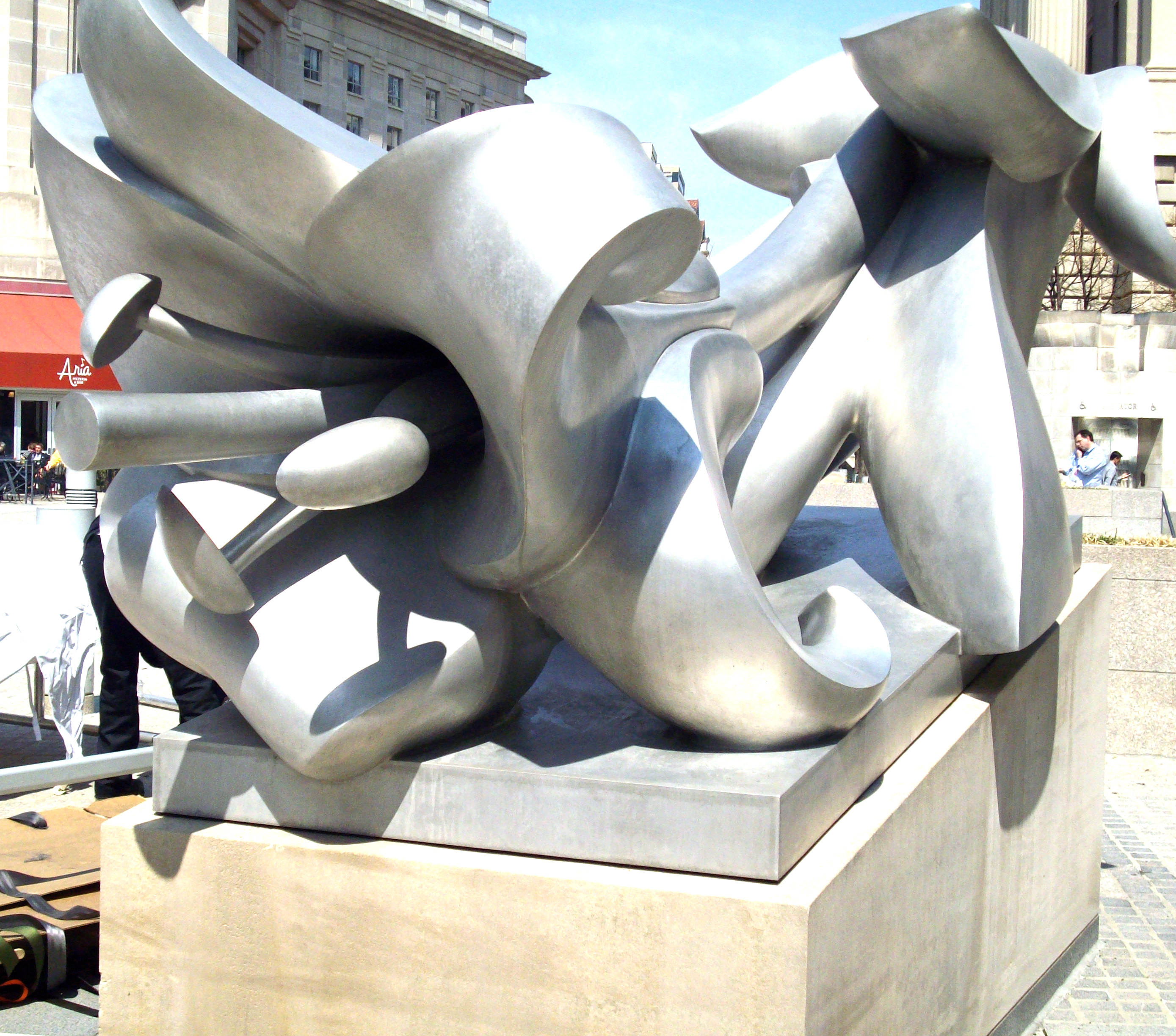 The Federal Triangle Flower is 10 feet tall and 13 feet wide. Created in 1997 as part of the Ronald Reagan Building and International Center, the courtyard art was sculpted by Stephen Robin. The limestone flower atop a sandstone base reflects the large amount of aluminum used in the buildings.