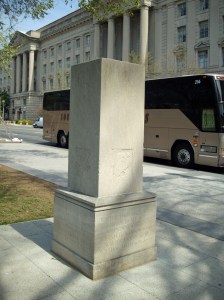 It’s the most nondescript marker in town. You’ve probably walked right by it on 15th St. N.W. by the many tourist trucks just short of Pennsylvania Ave. and never noticed it.