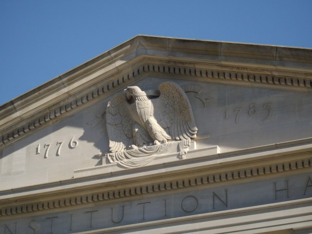 High above the western entrance into the Daughters of the American Revolution’s Constitution Hall is an eagle with 1776 on one side and 1783 on the other.