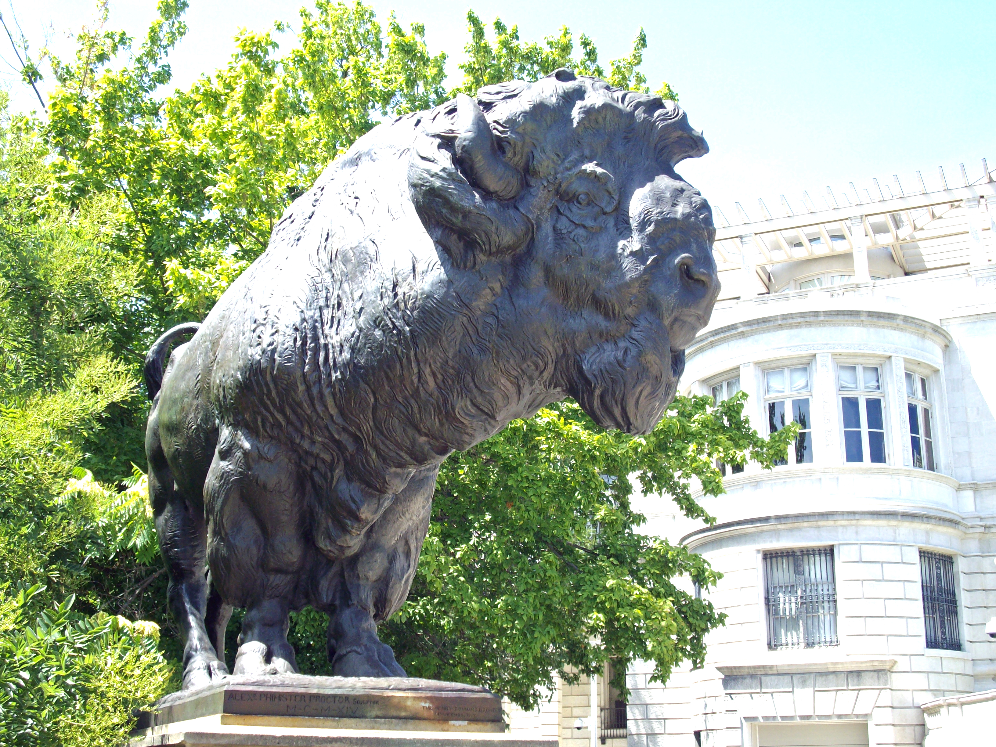 The 7-foot buffalos guard each corner of the bridge that was built in 1914. They were designed by A. Phimister Proctor, who also created the tigers on the 16th St. bridge. During the unveiling party, guests ate buffalo burgers. Gotta love that. Today, it’s a quiet corner and a great one to admire the buffalo.
