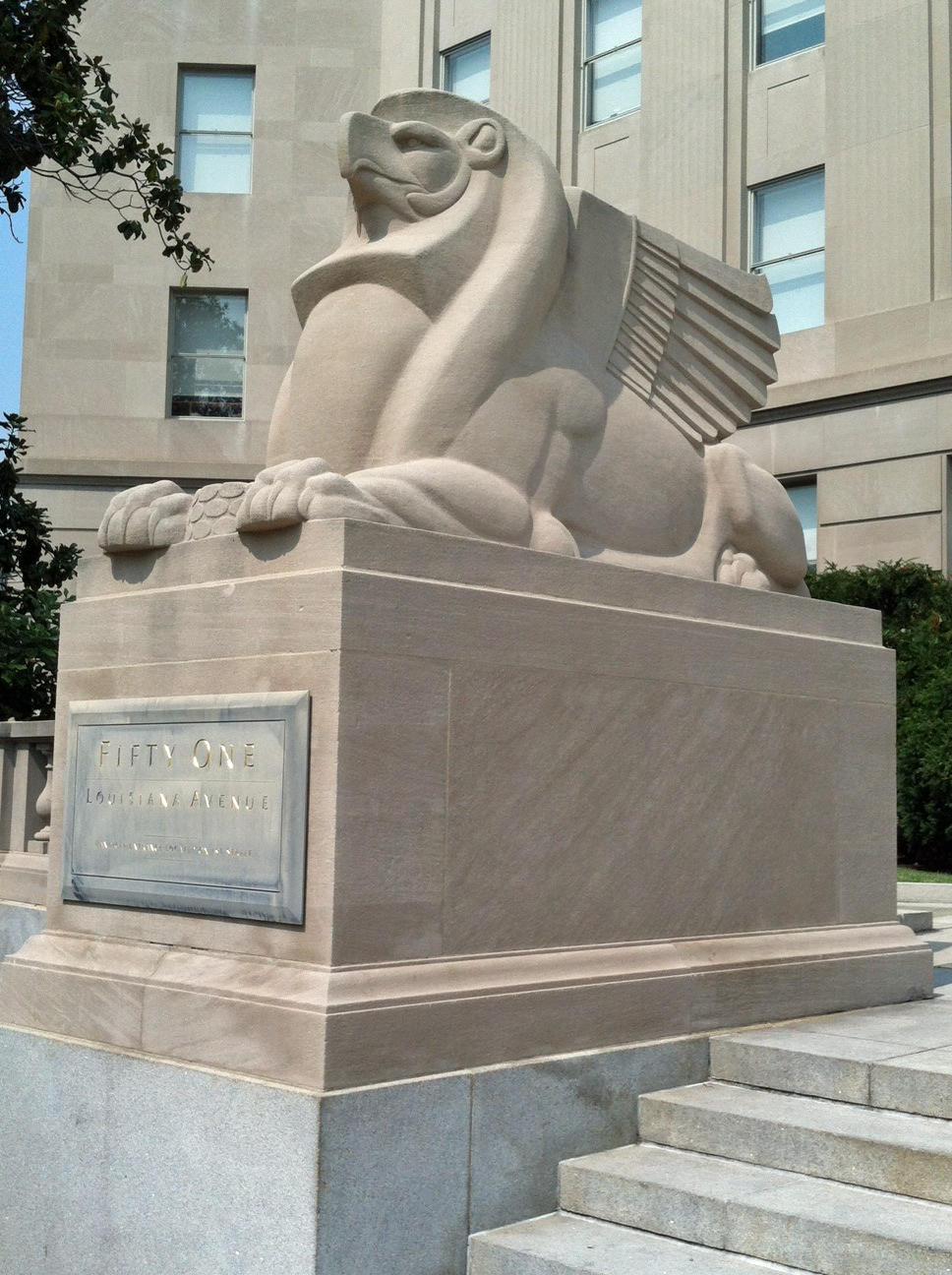Two Acacia Griffins protect the Acacia Mutual Life Insurance Building at 51 Louisiana Ave. N.W. in the shadow of the U.S. Capitol. The limestone sculptures by Edmond Romulus Amateis are 5 ½ feet wide, 4 ½ feet wide and 9 feet deep. The pair were placed by the main entranceway in 1936.