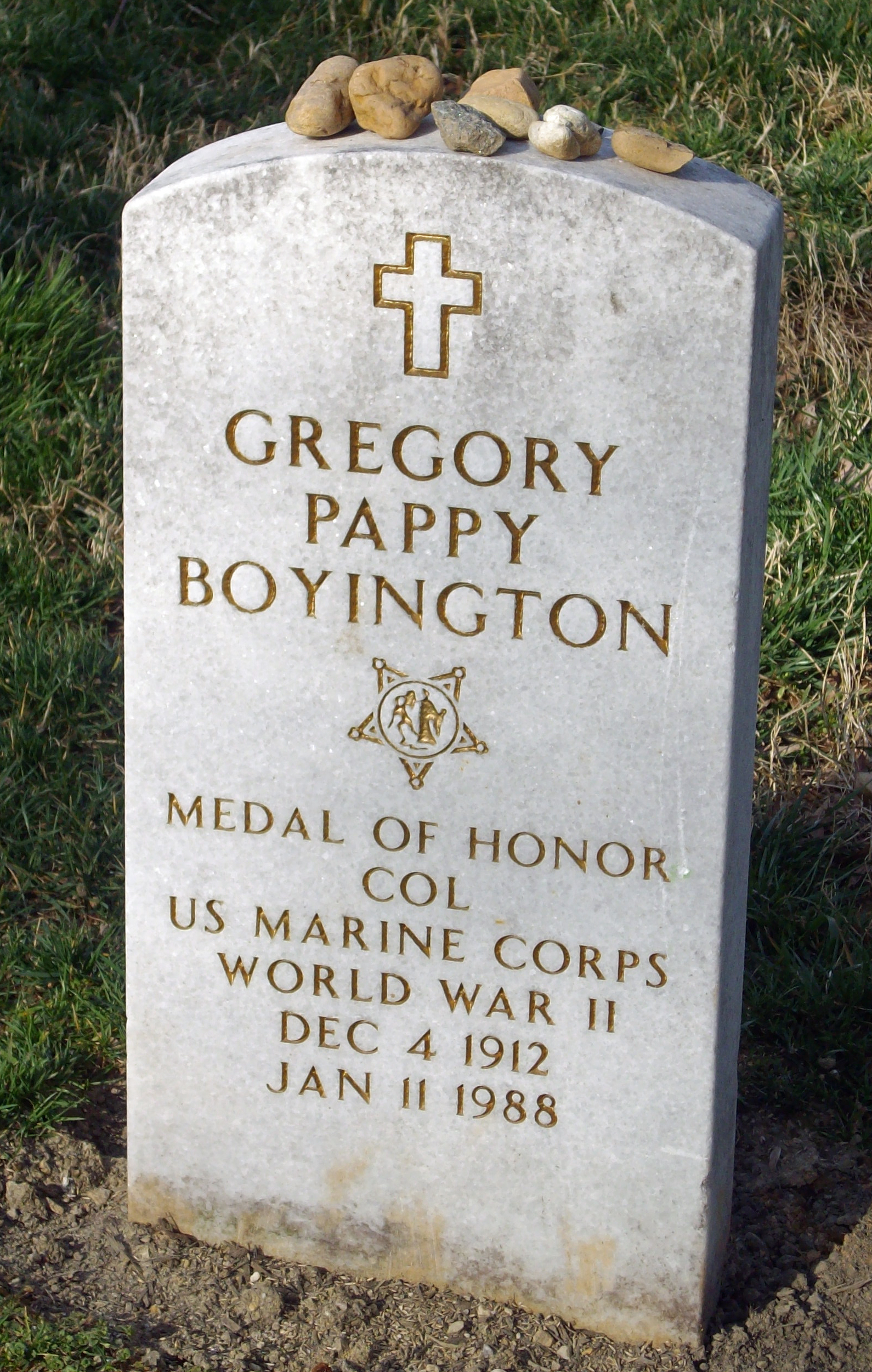 Boyington is buried in Arlington National Cemetery’s section 7A just a few stones to the left of boxer Joe Louis’ large marker.