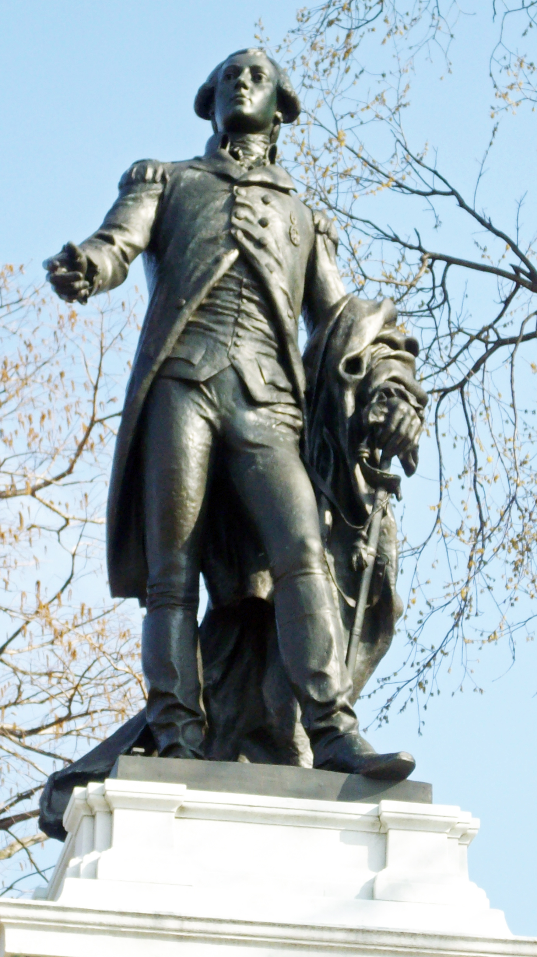Lafayette stands atop a marble pedestal wearing civilian dress, but carrying a sword. He holds a cloak in his left arm while his right is outstretched, maybe to friends.