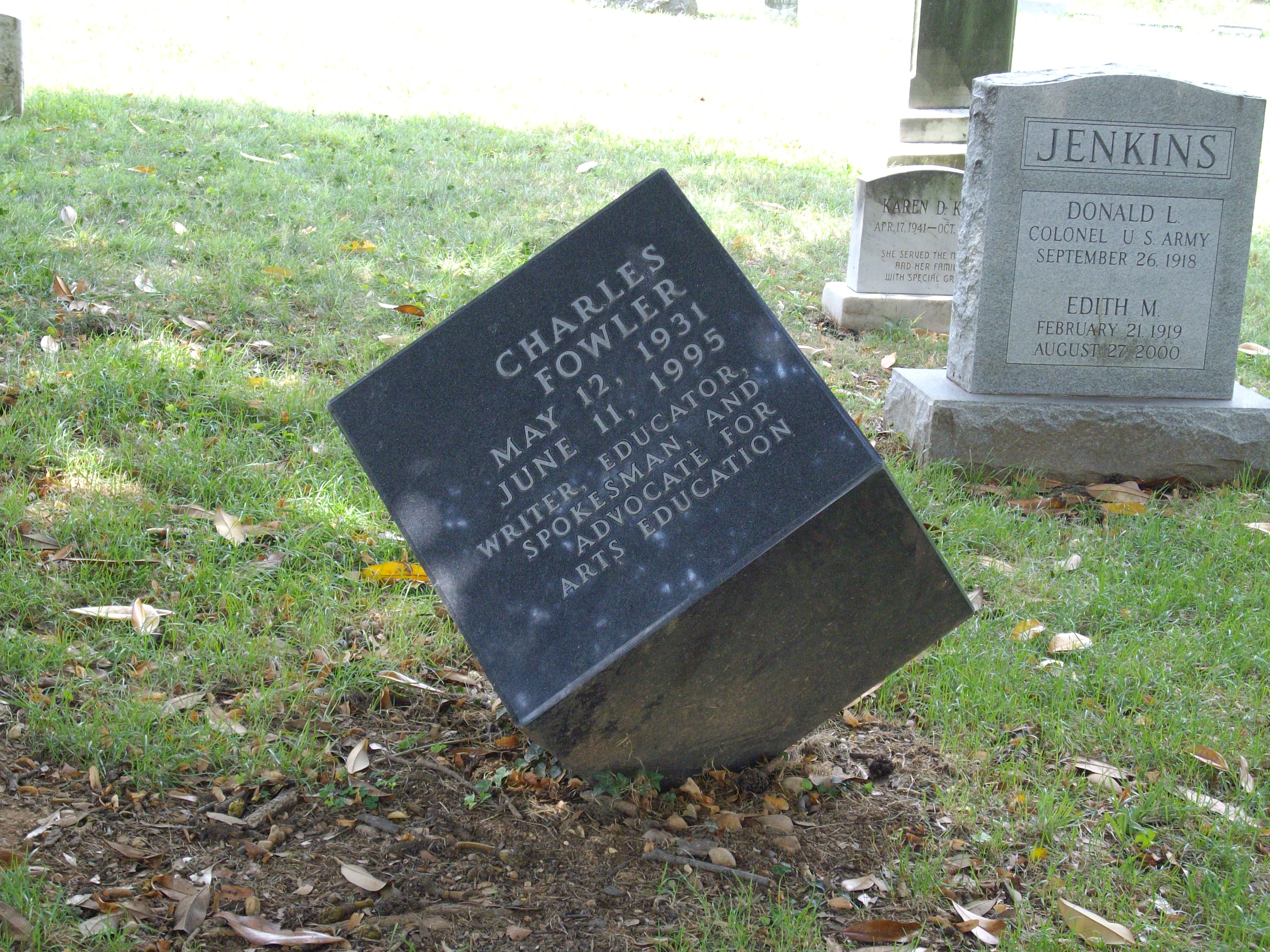 The graves of Charles Fowler and Kenneth Dresser are marked with a cube just 50 yards on the right once entering the gate. Fowler was a writer, educator and advocate for the arts who died in 1995. Dresser was a creative designer who died three months later.