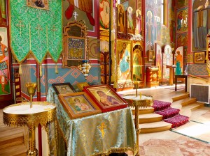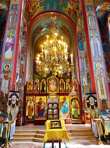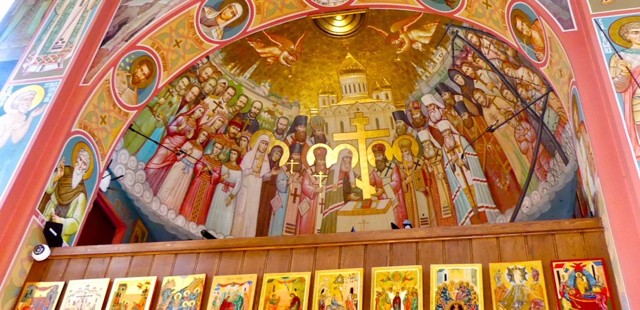 The cathedral replicates the 12th century St. Demetrius Cathedral in Vladimir, Russia. From 1991-94, Alexander Maskalionov and a team of iconographers painted iconic images through the interior. The website has plenty of images.