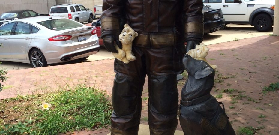 Now we mostly think of a fire house dog as a dalmatian riding atop the fire engine on the way to an emergency, but this monument remembers the 81 K-9 teams nationwide that handle “accelerant detection.” Translation: they look for sources of arson in the ashes, which is why the piece is called “Ashes to Answers.”