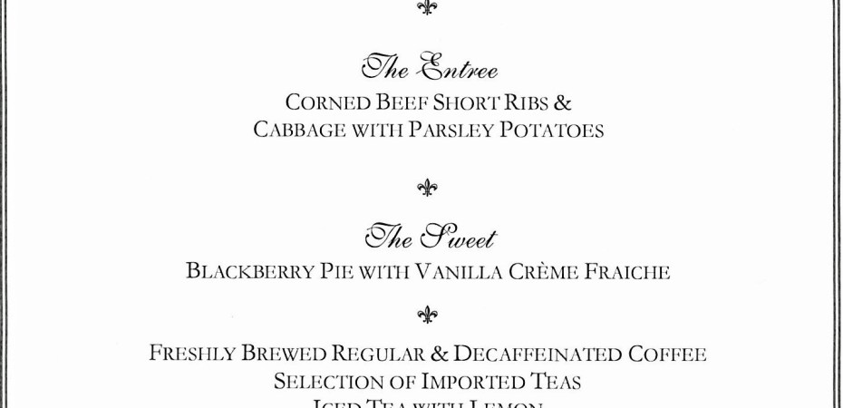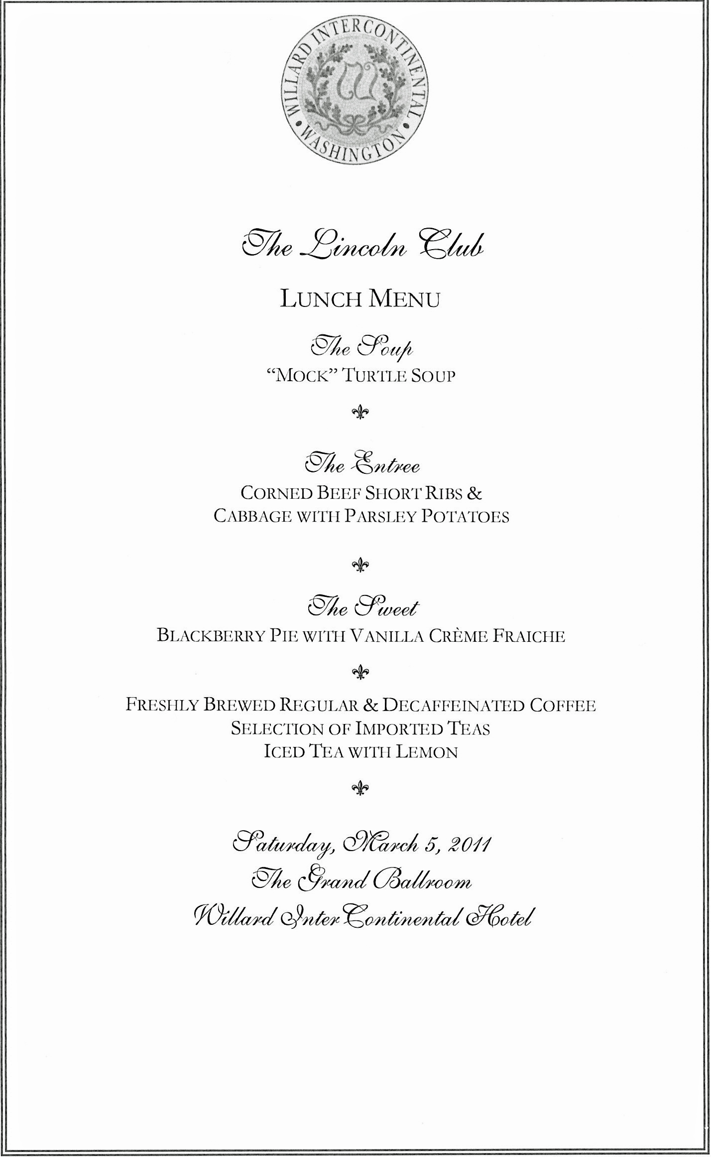 OK, I love food so I’ll start with the menu. It was the same as Lincoln’s first inaugural that was picked by the president himself. The only concession was “mock” turtle soup. I don’t think Campbell’s makes that, but it was very tasty. Kinda like beef barley. There was also corned beef, roasted potatoes and blackberry pie that I hadn’t eaten since I was a kid and we picked them growing wild.