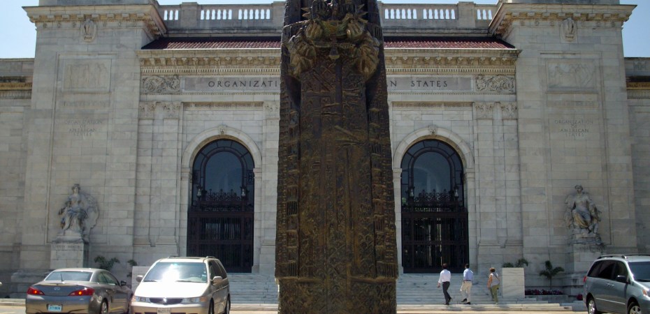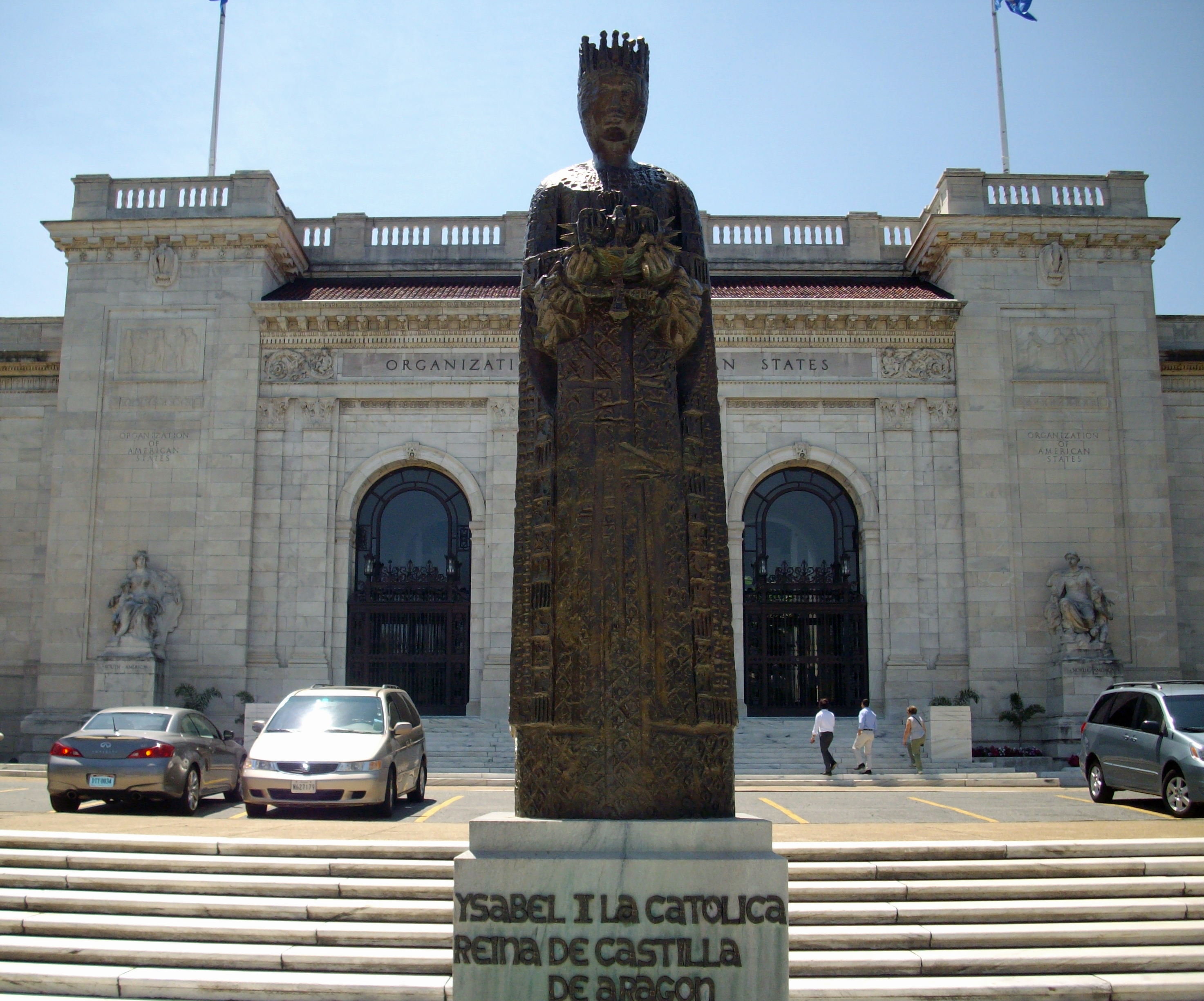 The Spanish monarch is in front of the Organization of American States on 17th St. The bronze life-sized statue has her holding a pomegrate with a dove emerging and wearing the crown of Castille. It was dedicated in 1966 as a gift from the Institute of Hispanic Culture of Madrid.