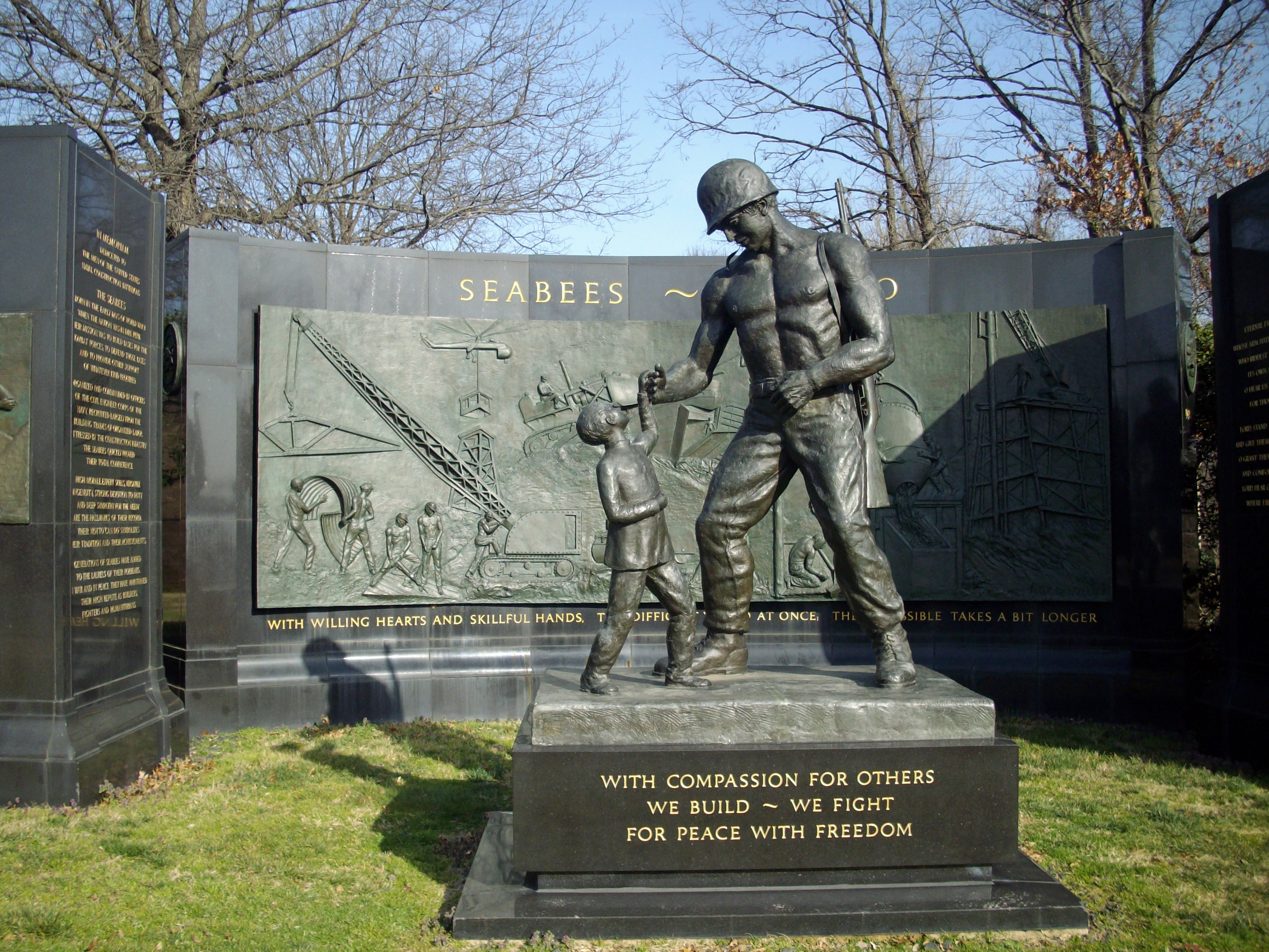 Located between the Memorial Bridge and Arlington National Cemetery, the nine-foot bronze statue is by Felix de Weldon, who you also know from his Iwo Jima Memorial nearby. The Seabee extends his hand to a young child with a wall depicting scenes of the unit’s capabilities.